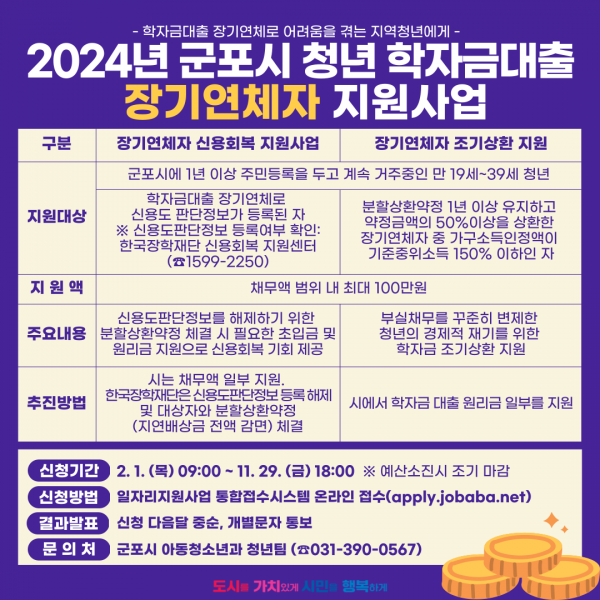 군포시 학자금대출 장기연체자 지원사업은 학자금대출 장기연체로 신용도 판단정보가 등록된 자의 신용회복을 지원하는 사업과 분할상환약정을 유지하고 약정금액의 50%를 성실히 상환한 장기연체자 중 기준중위소득이 150%이하인 자의 조기상환을 지원해주는 사업이다.