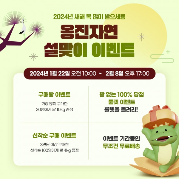[금요저널] 옹진군은 신선한 제철 상품 판매로 높은 인기를 누리고 있는 옹진군 대표 농수특산물 온라인 쇼핑몰 ‘옹진자연’에서 갑진년 새해를 맞아 22일부터 다음달 8일까지 설 맞이 감사 이벤트를 진행한다고 밝혔다.