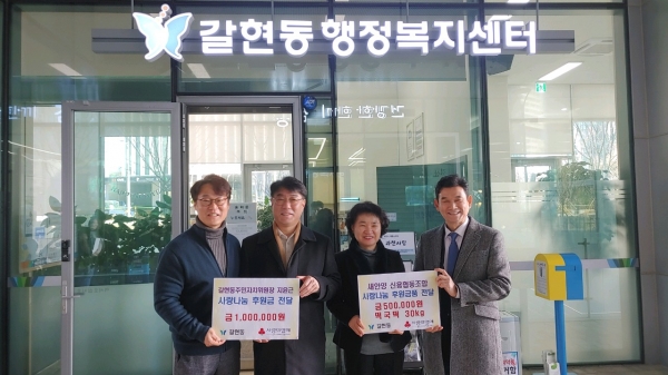 향후 지식정보타운에 신규지점 입점을 계획하고 있는 새안양신협은 앞으로도 갈현동의 온정 나눔에 지속적으로 적극 동참하겠다”고 밝혔다.