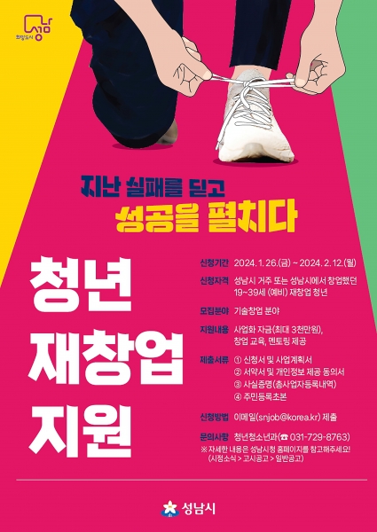 [금요저널] 성남시는 오는 2월 12일까지 ‘청년 재창업 지원사업’에 참여할 재창업자의 신청을 받는다.