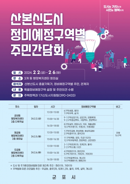 참석대상은 각 정비예정구역별 단지 주민이며 국토교통부에서 위촉한 산본신도시 총괄기획가 김용석 교수 및 용역 수행사인 KG엔지니어링과 군포시 주택정책과에서 참여하고 회의내용은 특별정비예정구역 설정, 산본신도시 정비방향, 인구 및 밀도계획 등을 설명하며 주민들의 의견과 제안사항 등을 청취하고자 한다.