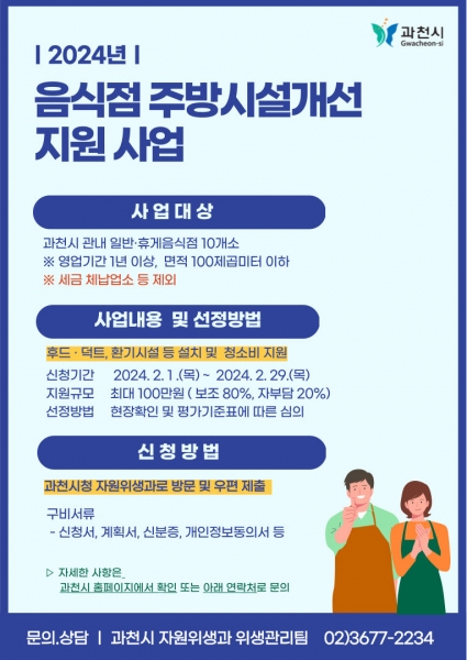 올해 과천시는 주방시설개선 지원사업으로 총 10개 업소를 지원하며 운영 뒤 개선 효과와 만족도를 분석해 사업 확대를 검토할 방침이다.