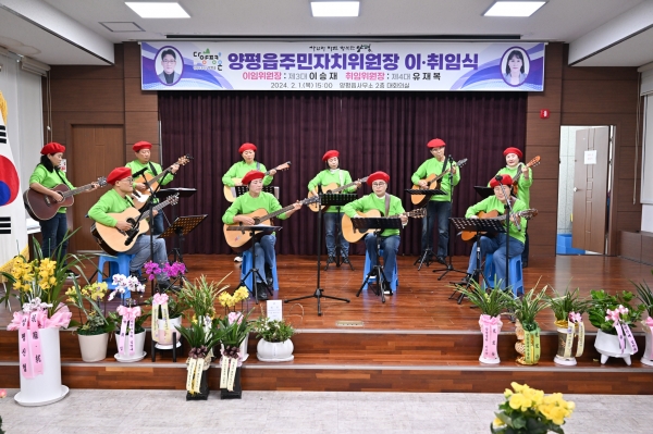 행사 시작에 앞서 양평읍 주민자치센터 통기타동아리의 식전 공연이 펼쳐졌으며 ▲이승재 이임위원장 활동 동영상 시청 ▲공로패 전달 ▲이·취임사 ▲내빈 축사 ▲기념 촬영 순으로 탄력 있게 진행됐다.