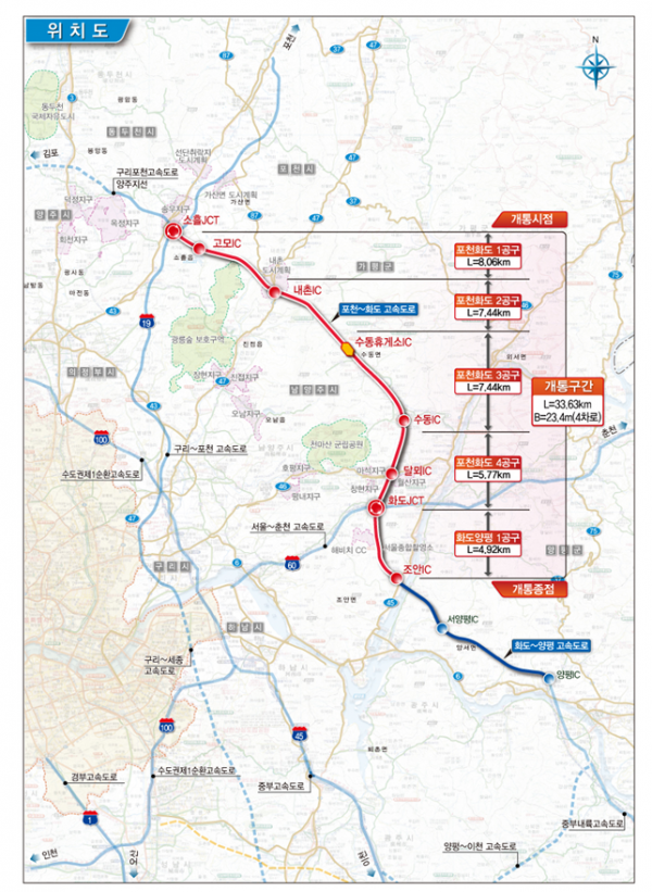 이번 개통으로 포천시 소홀읍에서 남양주시 조안읍까지의 이동거리는 약 16㎞ 감소하고 주행시간은 약 30분 단축될 것으로 예상된다.