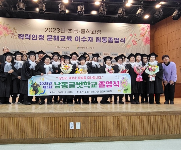 남동구 평생학습관의 남동글벗학교는 학습의 기회를 놓친 성인을 대상으로 초등학력인정 학습과정을 운영하는 프로그램으로 2023학년도 제3회 졸업식을 맞아 23명의 늦깎이 졸업생을 배출했다.