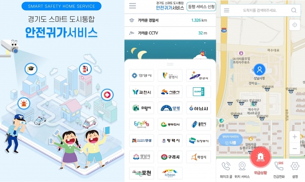 시의 안전귀가 서비스는 ‘안전귀가’ 앱을 설치한 사용자가 위험 상황에 직면했을 때 스마트폰을 흔들거나 위급상황 버튼을 누르면 현재위치가 지도기반으로 성남시청 8층 CCTV 통합관제센터와 지정된 보호자에게 자동으로 전송되는 구조다.