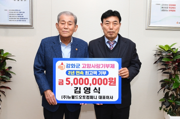 김영식 대표는 고향사랑기부제가 처음 시행된 2023년에도 개인이 기부할 수 있는 연 최고 금액인 500만원을 기부했으며 올해에도 500만원을 연이어 기부하며 2년 연속 강화군의 최고액 기부자가 됐다.