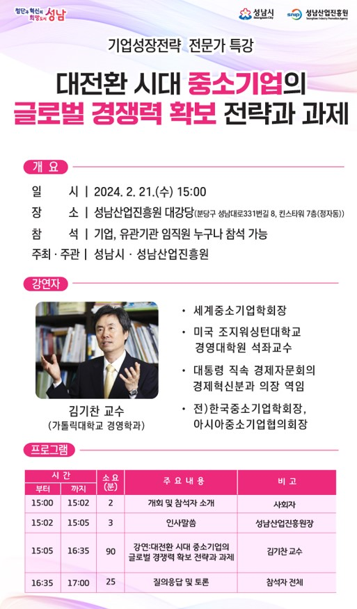 성남시 소재 중소벤처기업의 글로벌 경쟁력 증진 방안을 제시하기 위해 마련된 이번 특강에서는 중소기업 성장 전략 전문가 김기찬 가톨릭대 경영학과 교수가 강연자로 나선다.