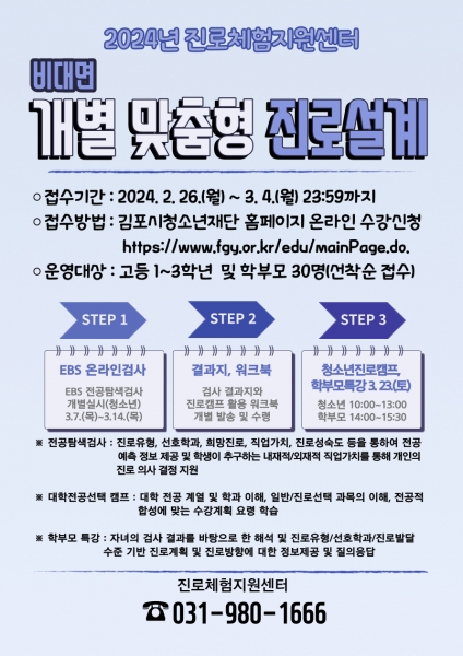 [금요저널] 김포시청소년재단 진로체험지원센터에서 진로 미결정 청소년의 진로설계 지원 및 진학 관련 고민 해소를 위한 ‘개별 맞춤형 진로설계사업’을 운영한다.