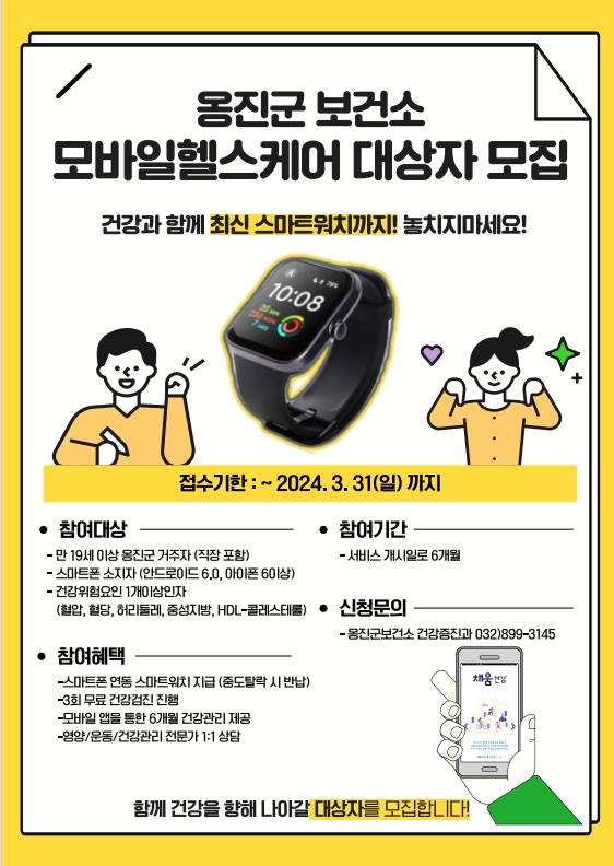 사업 대상자로 선정되면 손목형 스마트 워치가 무상으로 제공되며 참여 희망자는 옹진군보건소 건강증진과로 예약 상담전화 후 검진일정에 따라 참여할 수 있다.
