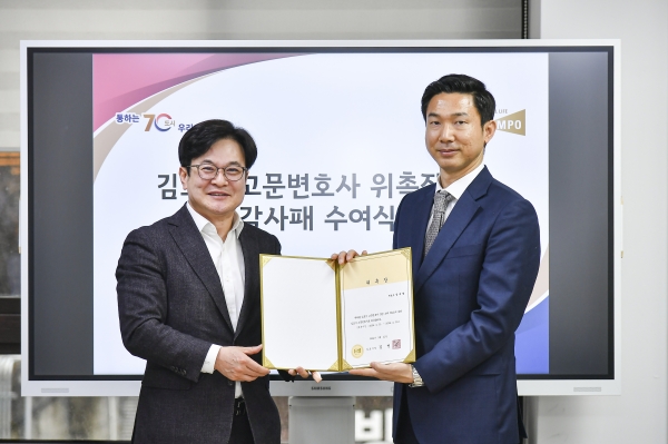 [금요저널] 김포시가 2월 21일 본관 2층 소회의실에서 고문변호사 임기가 만료된 김남두 변호사에게 감사패를 수여하고 정세형, 최경호 변호사를 김포시 고문변호사로 위촉했다.