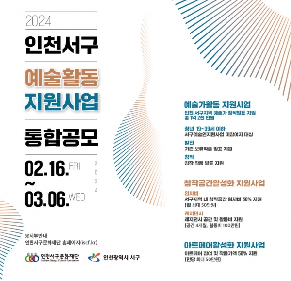 2024년 ‘예술인지원사업’의 자격요건, 지원규모 등의 세부사항은 인천서구문화재단 홈페이지에서 확인 가능하다.