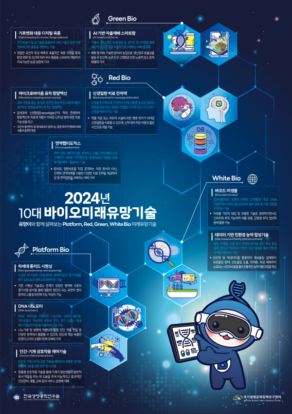 [금요저널] 과학기술정보통신부 와 한국생명공학연구원은 2월 26일 바이오 분야의 미래 비전을 제시할 ‘2024년 10대 바이오 미래유망기술’을 발표했다.