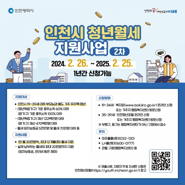 신청은 2025년 2월 25일까지로 만 19세~34세는 ‘복지로 홈페이지’에서 온라인 신청하거나 주소지 읍·면사무소를 방문하면 되고 만 35세~39세의 경우 ‘인천청년포털’에서 온라인 신청 또는 주소지 읍·면사무소를 방문하면 된다.