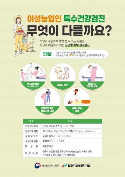 검진 항목은 근골격계, 심혈관계, 골절·손상위험도, 폐활량, 농약 중독 5항목과 예방 교육 4항목으로 기존 검진과는 다르게 여성농업인에게 특화돼 있다.