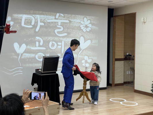 □ 입학식은 만3, 4, 5세 유아들이 오전 10시에 경산압량초등학교 시청각실에 모여 진행하였으며, 국민의례와 입학허가 선언, 원장 인사, 입학 기념 꽃 전달, 샌드아트 및 마술공연 순으로 진행하였다.