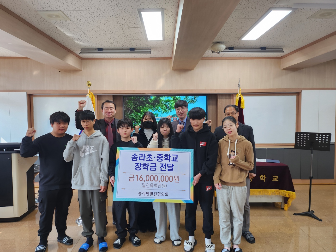 송라면 발전협의회 회장 윤○○은 송라중학교 전교생에게 장학금 50만원씩을 전달하며 꿈을 갖고 지역인재로 훌륭하게 성장하길 바란다며 학생들을 격려하였다.