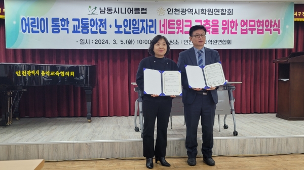 업무협약식은 남동시니어클럽 홍정민 관장과 인천광역시학원연합회 이선기 회장이 참석한 가운데 노인의 보람된 삶을 지원하고 어린이의 안전한 교통문화를 정착하기 위한 상호 협력을 위해 이뤄졌다.