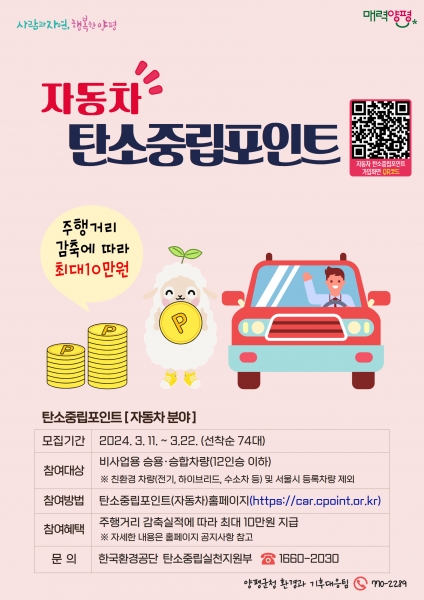 [금요저널] 양평군이 자동차 탄소중립포인트 참여자를 이달 11일부터 22일까지 선착순 74명을 모집한다고 밝혔다.