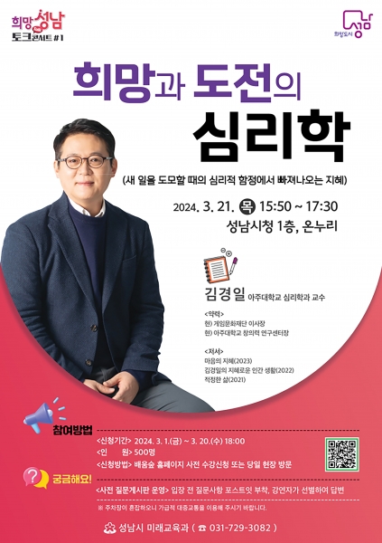 [금요저널] 성남시는 올해 첫 ‘희망성남 토크콘서트’ 강연자로 김경일 아주대학교 심리학과 교수를 초빙해 오는 3월 21일 오후 3시 50분 시청 1층 온누리에서 명사 특강을 연다.