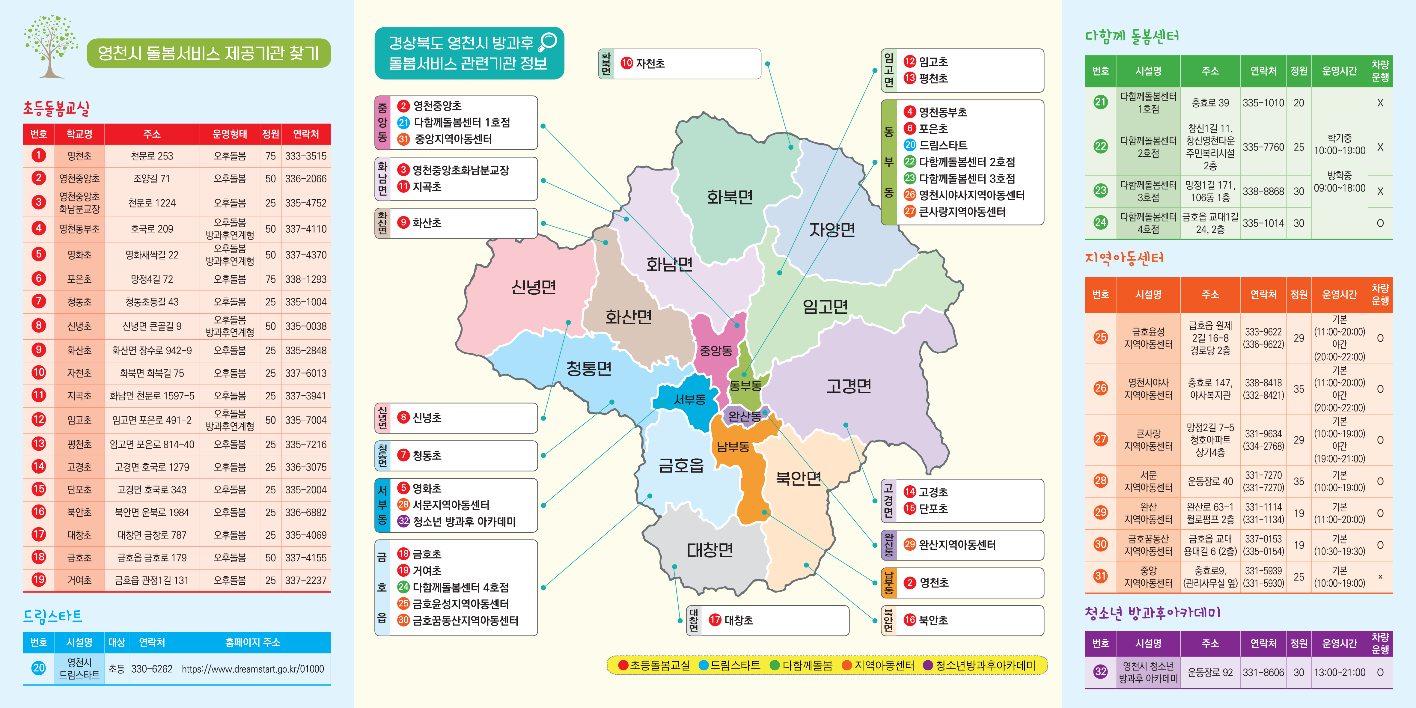 영천 지역 돌봄 안내지도에는 초등돌봄교실(분교 포함) 18개교, 다함께 돌봄센터 4개소, 지역아동센터 7개소, 청소년 방과후 아카데미 1개소, 드림스타트 1개소의 모든 정보가 제공된다. 시설의 위치, 연락처, 정원, 운영시간, 차량 운행여부도 포함되어 있다.