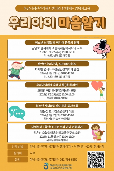 [금요저널] 하남시는 이번 달 22일부터‘우리아이 마음알기’부모 교육을 신장·미사·감일·위례 4개 권역에서 실시한다.