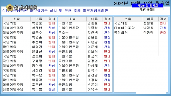 [금요저널] 성남시의회 더불어민주당협의회는 정연화 의원이 대표 발의한 ‘성남사랑상품권 활성화기금 설치 및 운용 조례 일부개정안’이 ‘상품권 권면 금액의 100분의 10으로 할인 판매’하기로 원안가결 되었으나 국민의힘에서 또다시 상임위의 의결을 무시하고 재상정해 지난 11일 성남시의회 제291회 임시회 2차 본회의에서 찬반 표결 끝에 국민의힘 의원이 전원 반대해 채택이 불발된 것에 강한 유감을 표명했다.