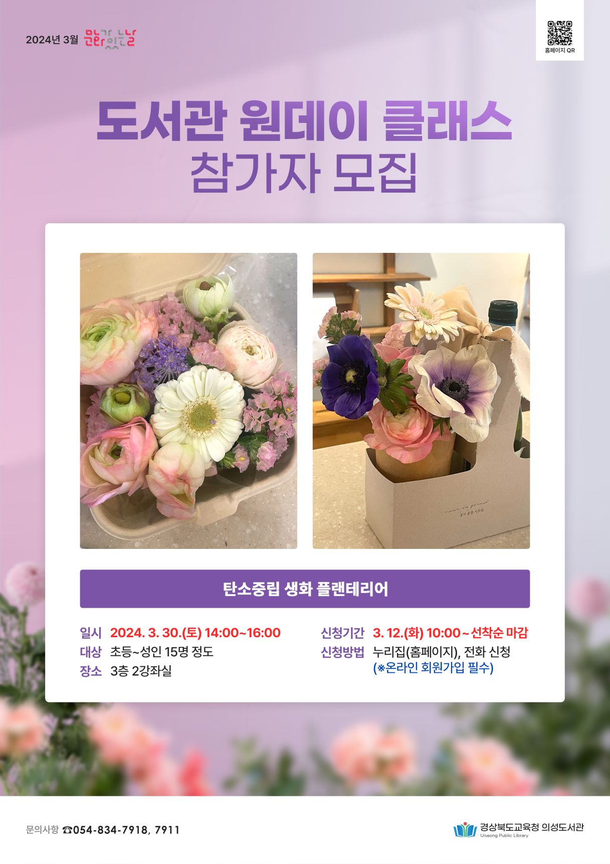 □ 경상북도교육청 의성도서관(관장 유명량)은 3월 문화가 있는 날 행사로 3월 30일 토요일 오후 2시 생화 플랜테리어 원데이 클래스 프로그램을 진행한다고 밝혔다.