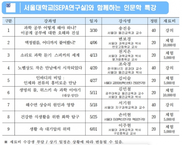 이현재 시장은 “서울대의 우수한 교육 인프라를 활용해 인문학적 소양과 창의·융합교육 역량을 높일 기회를 제공해드리고자 이번 특강을 준비하게 됐다”며 “가족 단위로 참여할 수 있도록 주말에 강좌를 개설한 만큼 수강신청을 통해 가족이 함께 봄나들이를 겸해 참석하실 것을 추천해 드린다”고 말했다.