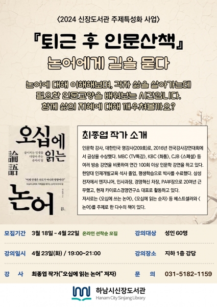 [금요저널] 하남시는 직장인을 대상으로 진행되는 야간 인문학 강연인 ‘퇴근 후 인문산책’ 참여자를 오는 18일부터 모집한다고 밝혔다.