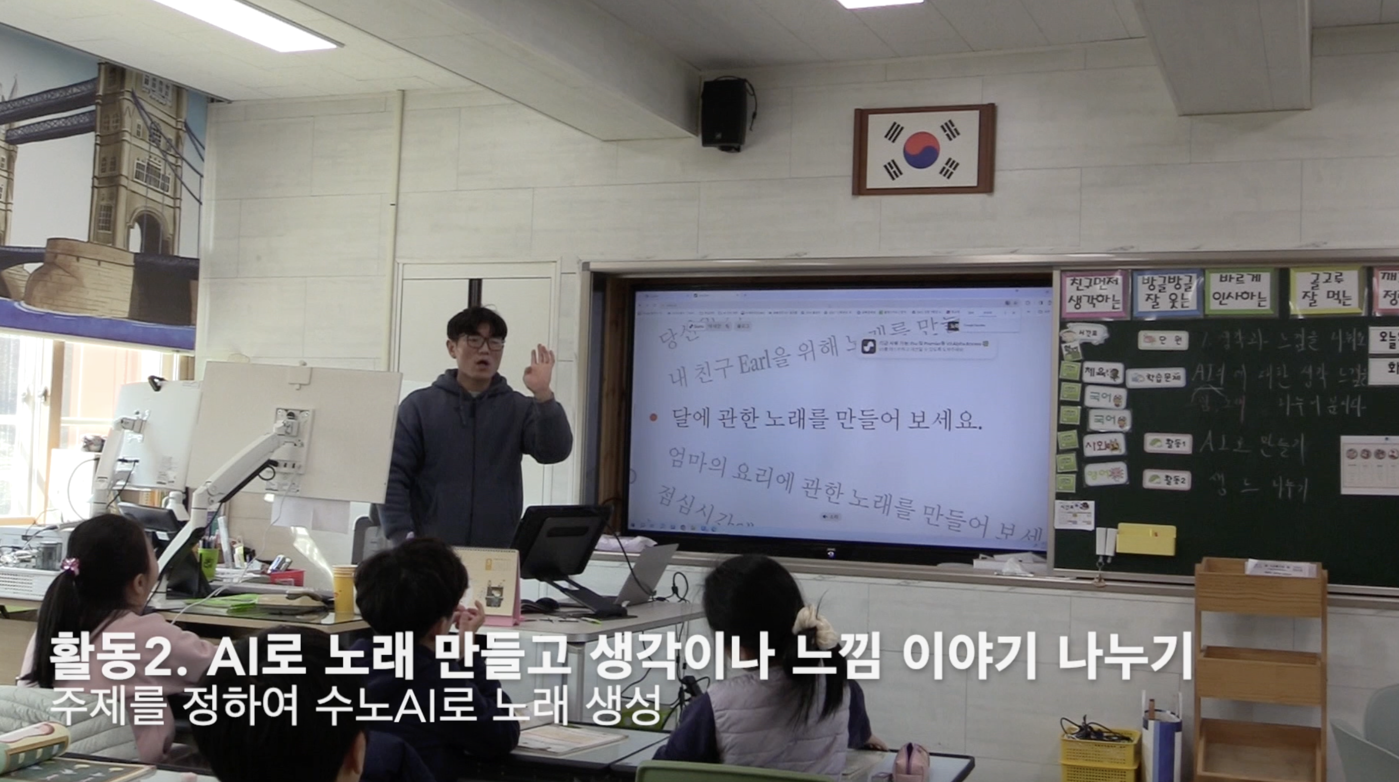 □ 봉성초등학교(교장 장상진)는 AI 정보 교육 중심 학교 및 디지털 온 선도학교, 미래형 융합교육(STEAM) 선도학교로서 혁신적인 교육 방법을 통해 학생들을 미래에 안착시키고 있다. 최근 봉성초등학교에서는 AI 기술을 활용한 수업으로 코파일럿과 SUNO AI를 적용한 국어 수업을 진행했다. 이 수업에서는 AI가 생성한 이미지와 노래를 통해 학생들은 자유롭게 생각과 느낌을 나누었으며 이를 통해 학생들은 AI가 생성한 그림과 노래에 대한 자신만의 해석과 감상을 나누며, 창의적 사고와 감성을 발휘할 수 있는 기회를 얻었다.