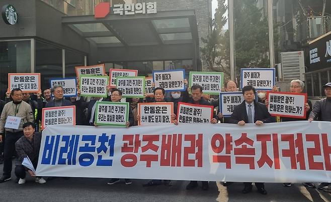 국민의힘 광주시당 책임당원들도 이날 중앙당사 앞에서 집회를 열어 "비례 공천으로 국민의미래는 미래가 없고 국민의힘은 당원들에게 신뢰를 잃었다"며 "국민의힘은 당원들과의 약속을 저버렸다"고 비판했다.