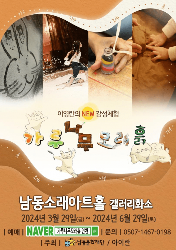 [금요저널] 인천시 남동문화재단은 3월 29일부터 6월 29일까지 남동소래아트홀 갤러리 화·소에서 어린이들을 위한 체험전 ‘감성체험 가루 나무 모래 흙’을 개최한다고 20일 밝혔다.
