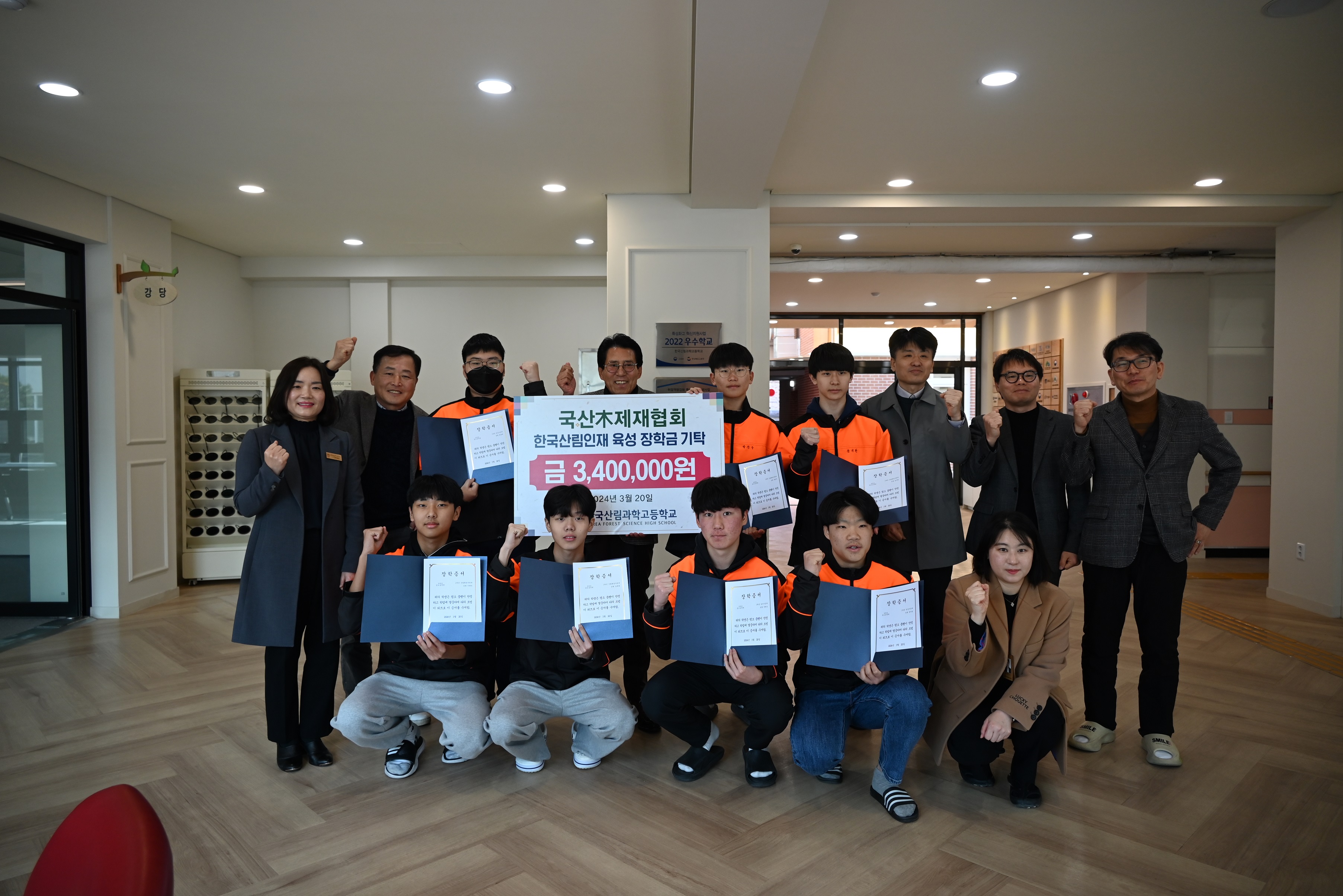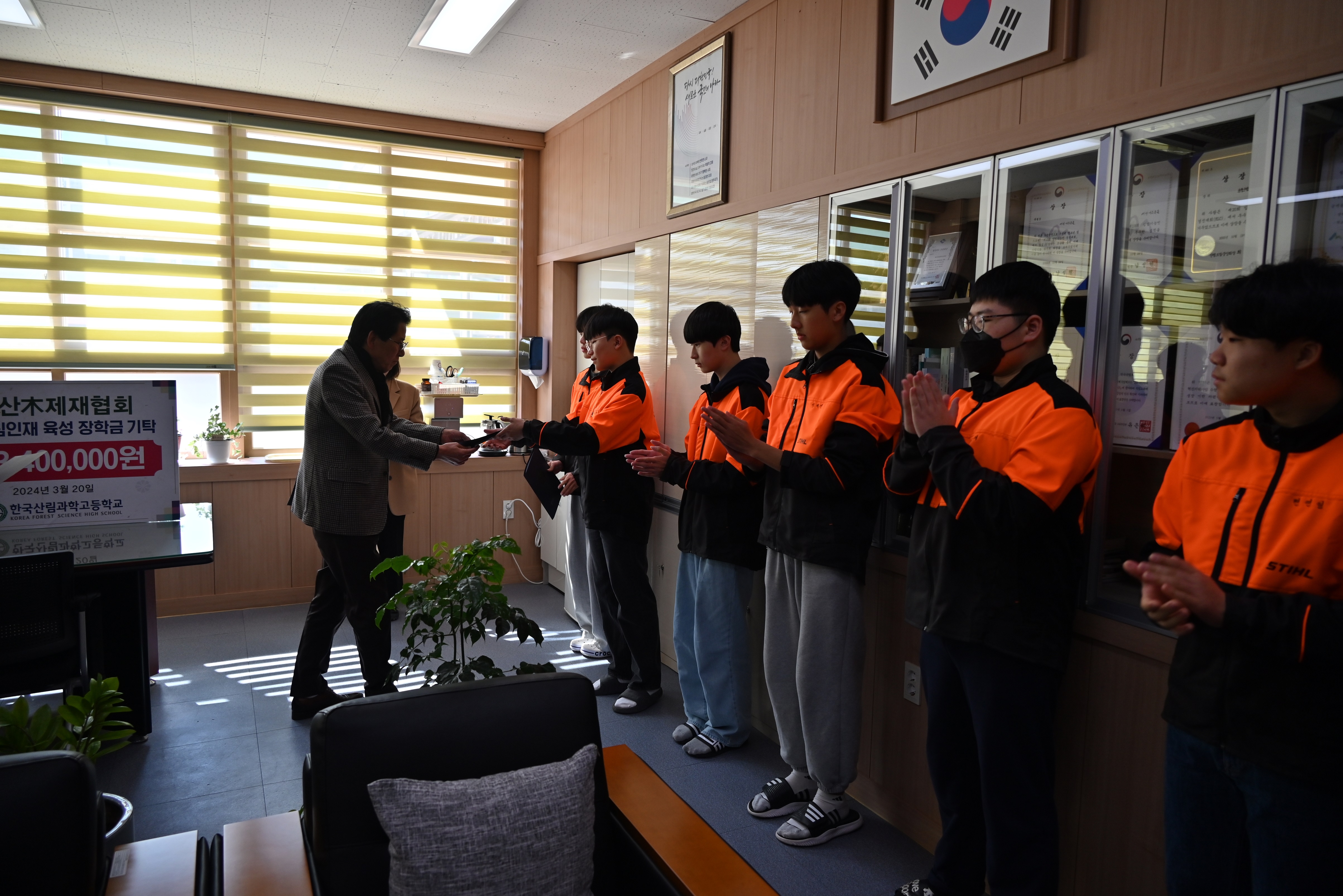 한국국산목제재협회(회장 신용구)는 2024. 3. 20(수) 11:00 경상북도 봉화군에 있는 한국산림과학고등학교를 방문하여 윤정란 교장과 장학생 7명이 참석한 가운데 산림분야 미래인재 양성을 위한 장학금을 수여했다.