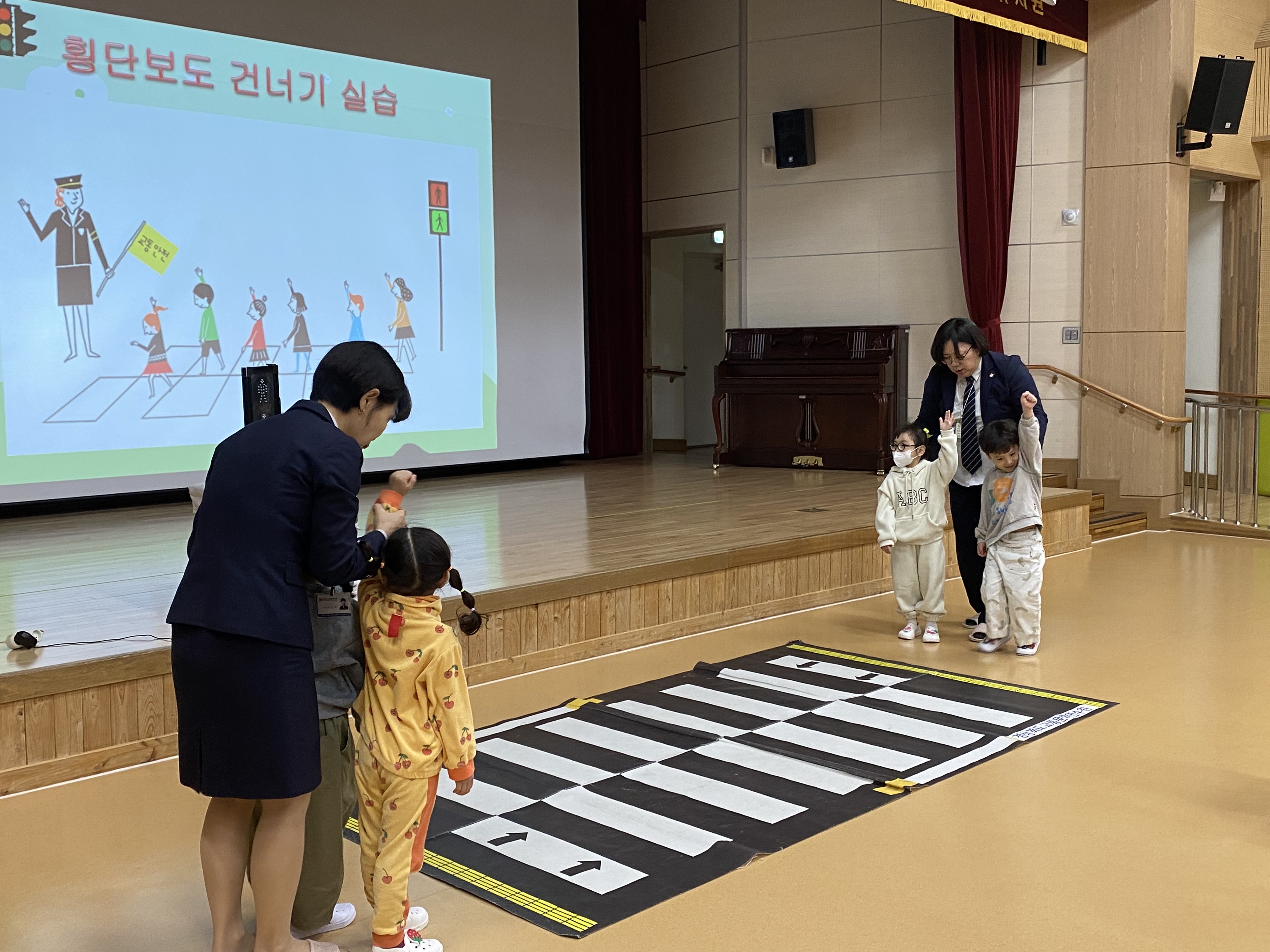 □ 교통안전교육은 안전 전문가와 함께 동영상 및 시청각 자료를 활용해 교통신호의 의미와 야외놀이 시 주의 사항 및 안전한 등·하원 시 보행 방법에 대해 알아보고 실습을 통해 직접 신호등을 건너보는 순서로 진행되었다.