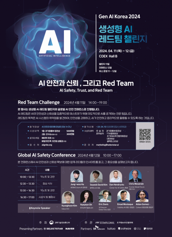이어 행사 2일차에는 Cohere Aidan Gomez 대표, Stability AI Emad Mostaque 대표, 프론티어모델 포럼 Chris Meserole 의장, xAI Dan Hendrycks 안전 담당고문, 네이버 하정우 퓨처 AI 센터장, SKT Eric Davis 부사장, 셀렉트스타 김세엽 대표, 카카오 김경훈 이사, 카이스트 오혜연 교수 등 국내·외 대표 AI 기업·기관·전문가가 참여하는 ‘글로벌 AI 안전 컨퍼런스’를 개최하고 생성형 AI 안전·신뢰성 확보방안을 논의한다.