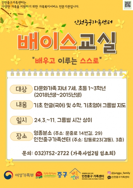 인천중구가족센터, 다문화자녀 기초학습 돕는 ‘베이스 교실’ 참가 아동 모집