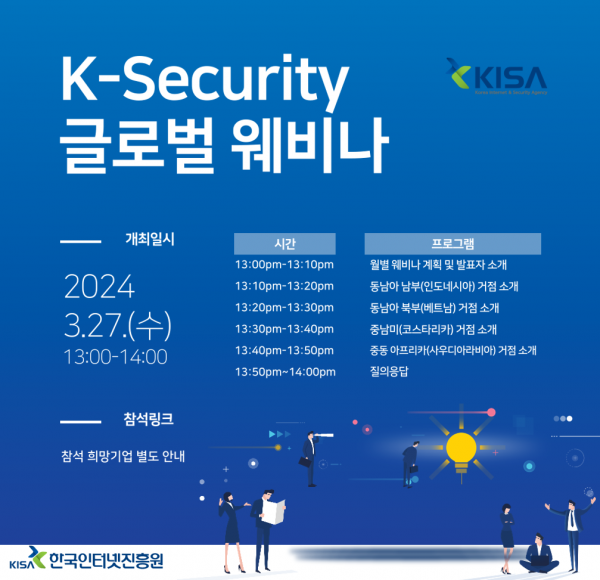 ’24년 ‘K-시큐리티 글로벌 웨비나’의 첫 미팅은 ’24. 3. 27. KISA 해외진출 전략거점 소장 4인이 모두 참여해 거점별 정보보호 사업 추진현황, 현지 특성 및 주요 이슈사항, ’24년 사업 추진계획을 소개하는 온라인 회의로 마련되며 향후 각 거점별로 기업 수요를 조사해 월별 웨비나를 연중 추진할 계획이다.