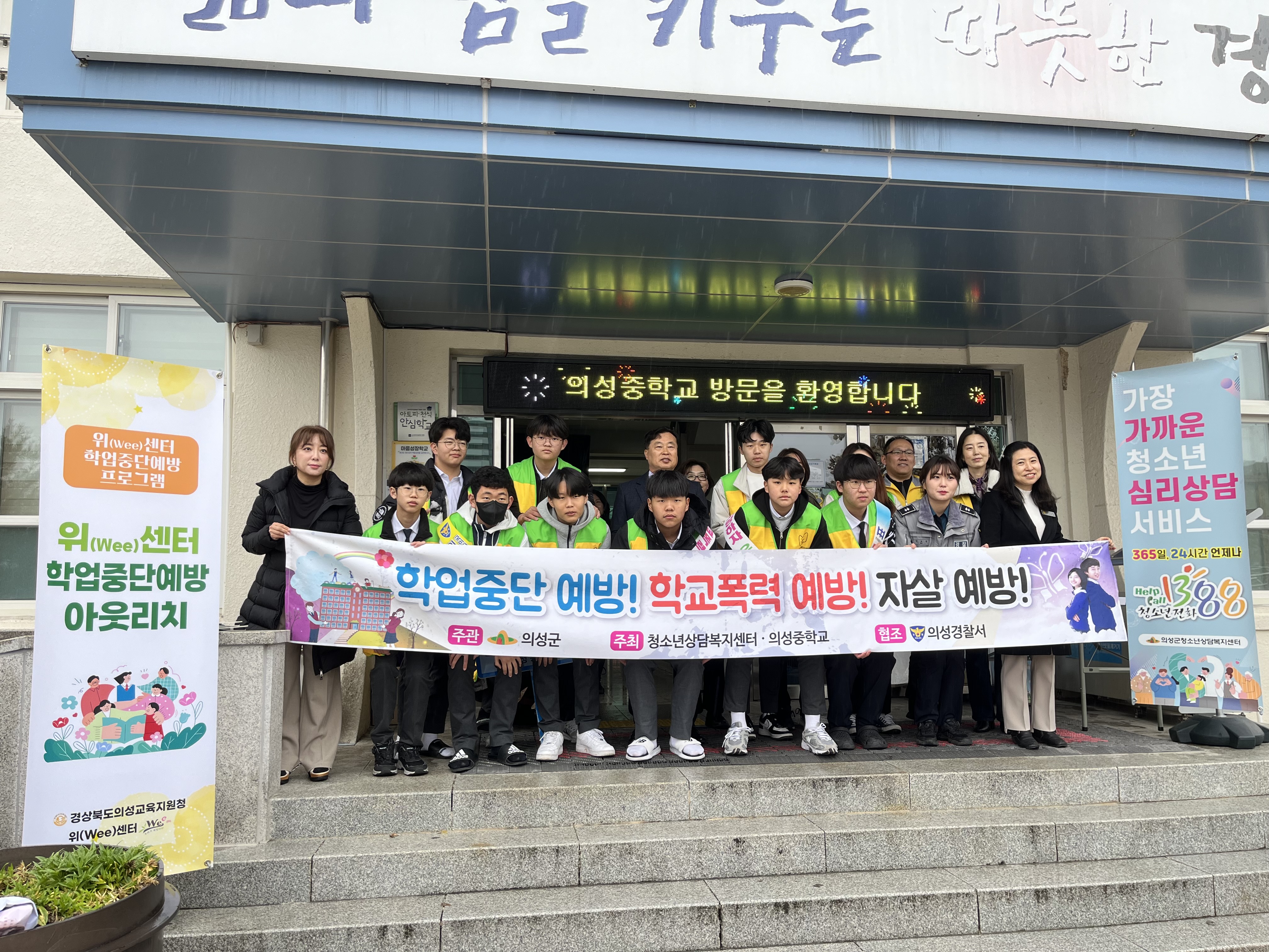 의성중학교(교장 장재익)는 3월 26일(화) 의성교육지원청 WEE센터, 의성경찰서, 의성군청소년상담복지센터와 협업하여 전교생을 대상으로 『학교폭력예방 캠페인』을 실시했다고 밝혔다.