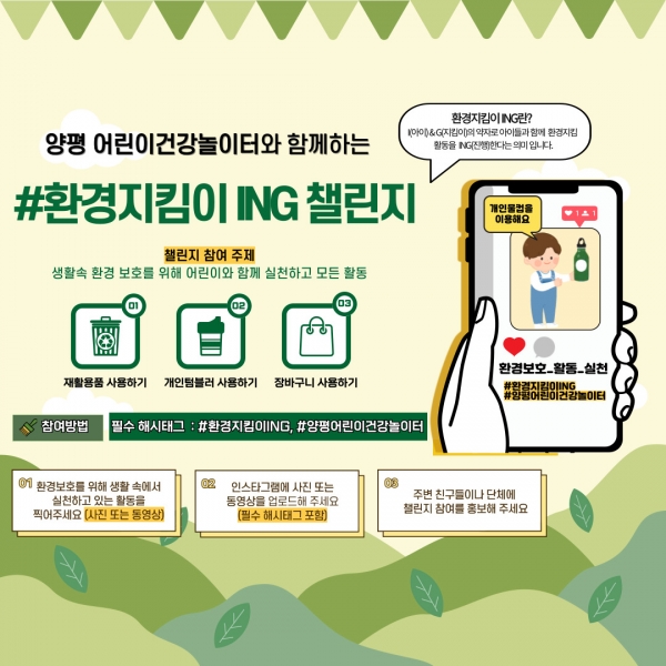[금요저널] 양평공사는 오는 4월부터 양평 어린이건강놀이터를 이용하는 고객을 대상으로 환경보호 실천을 위한 ‘환경지킴이 ING 챌린지’를 시작한다고 밝혔다.