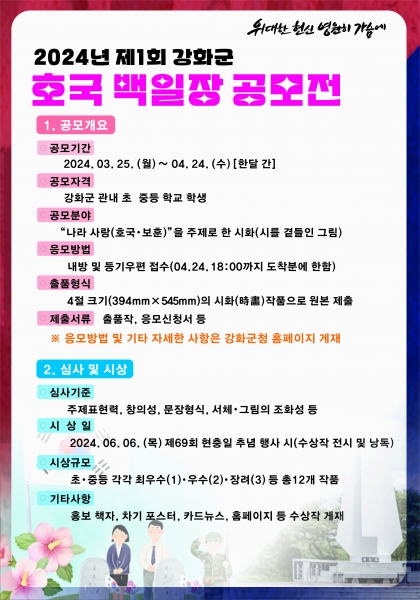 순국선열과 호국영령의 숭고한 나라 사랑 정신을 계승하기 위해 추진되는 이번 백일장은 나라 사랑을 주제로 한 시화 작품을 신청받으며 강화군에 재학 중인 초·중학생이라면 누구나 참가할 수 있다.