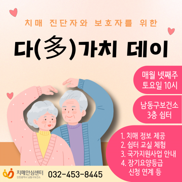 [금요저널] 인천시 남동구 치매안심센터는 치매 신규환자 및 보호자를 위한 치매안심센터 만남의 날 ‘다가치데이’를 운영한다고 28일 밝혔다.
