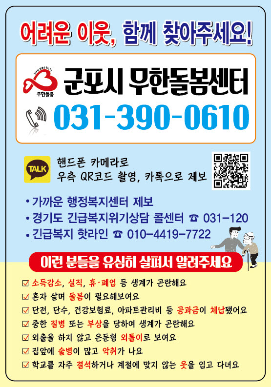 한편 군포시는 어려움에 처한 위기가구를 조기에 발견하고 제보하는 무보수·명예직인 ‘명예사회복지공무원’을 상시 운영중이다.