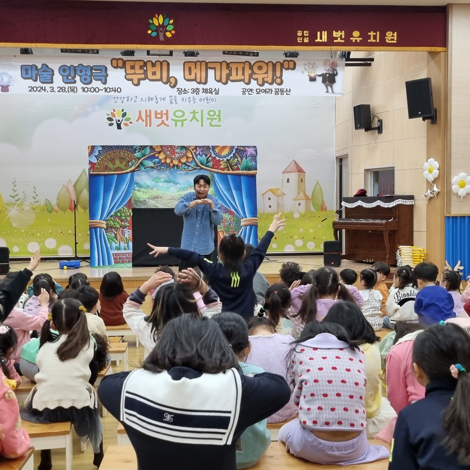 □ 예천군 공립 단설 새벗유치원(원장 우수경)은 3월 28일(목) 3층 체육실에서 유아 122명을 대상으로 마술 인형극 ‘뚜비 메가파워’ 공연을 관람했다.