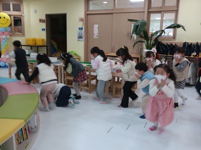 장소로 이동: 유아들은 손수건으로 입을 막은 후 신속하게 대피 장소로 이동했다. 우리 유치원에서 처음 참여하는 3세반 유아는 교사가 옆에서 함께 이동하며 안내하였다.