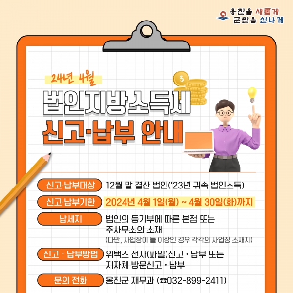 [금요저널] 옹진군은 오는 4월30일까지 2023년 귀속 사업연도 법인소득에 관한 법인지방소득세 신고·납부 기간을 운영한다고 밝혔다.