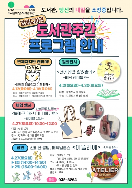 강화 도서관은 ‘매직벌룬쇼’, ‘북마크 매단 미니 에코백 만들기’ 등의 체험행사와 ‘‘너에게만 알려줄게’ 원화 전시’를 운영한다.