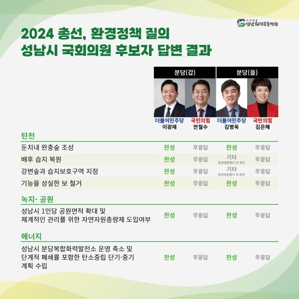 8명의 후보자 중 중원구 더불어민주당 이수진 후보와 국민의 힘 윤용근 후보, 분당갑 더불어민주당 이광재 후보는 5개 영역, 14개의 환경정책에 대해서 찬성했다.