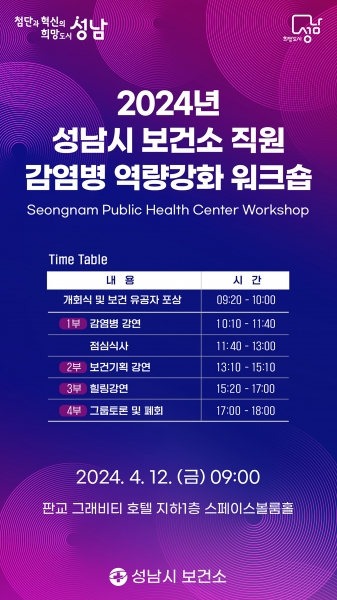[금요저널] 성남시는 오는 4월 12일 오전 9시~오후 6시 지역 내 호텔에서 수정·중원·분당구 보건소 직원들의 감염병 예방 역량을 강화하기 위한 워크숍을 개최한다.
