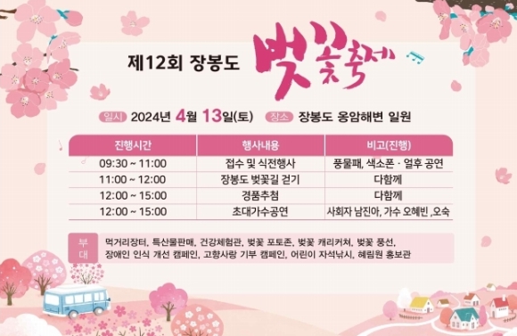 걷기행사 이후에는 초대가수 공연이 화려하게 펼쳐질 예정이며 그 외에도 장봉부녀회에서 운영하는 푸짐한 먹거리 장터, 벚꽃 포토존·캐리커쳐 체험 프로그램 등 다채로운 부대행사가 준비되어 있다.